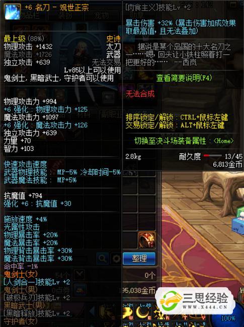 武器方面首選85級SS太刀“名刀-觀(guān)世正宗”,附加效果中包含有【人劍合一】技能等級+2。