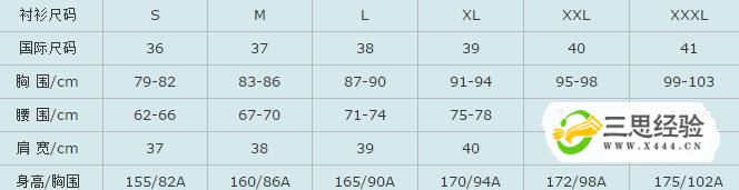 女襯衫標準尺碼對照表。