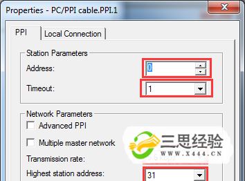 彈出“屬性(Properties-PC/PPI cable.PPI.1)”面板,先選擇PC的連接方式(USB/COM1);之后根據PLC的參數來(lái)選擇PPI的相關(guān)參數,如紅框所示。