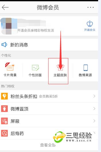 鼠標移動(dòng)到微博會(huì )員點(diǎn)擊打開(kāi)之后,看到里面有很多設置,這時(shí)候我們在最上面個(gè)性化欄目那里,看到有一個(gè)主題皮膚選項并點(diǎn)擊打開(kāi)。