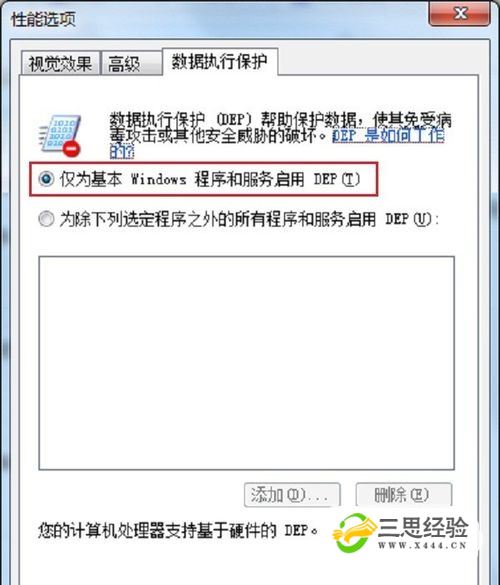 第四步在數據執行保護里面選擇“僅為基本的Windows程序和服務(wù)啟用DEP功能”,點(diǎn)擊確定就完成了,如下圖所示: