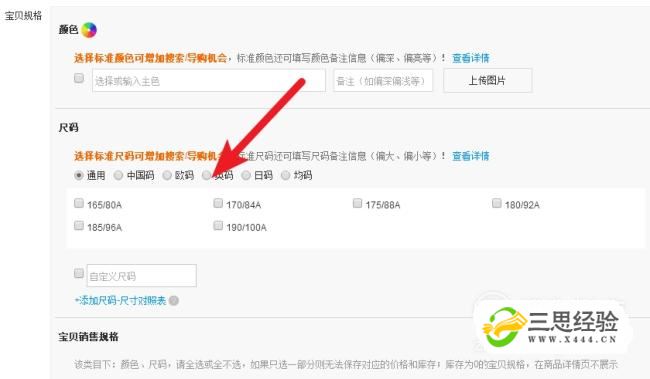 定義寶貝的尺碼和顏色。