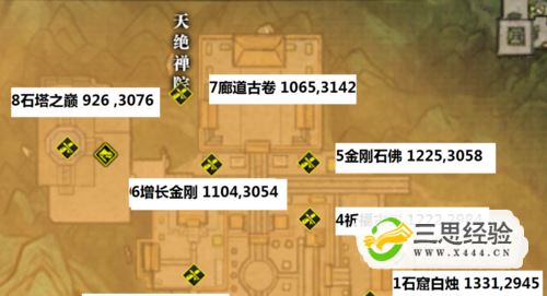 最省時(shí)路線(xiàn)分析,建議按照如下標記的1-8的順序找尋1石窟白燭 1331,29452石窟紅燭 1399,28853禪字影壁 1083,29194祈福古樹(shù) 1222,29845金剛石佛 1225,30586增長(cháng)金剛 1104,30547廊道古卷 1065,31428石塔之巔 926 ,3076