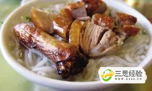燒鵝瀨粉。瀨粉是東莞人壽宴的傳統食品,寓意長(cháng)長(cháng)久久,多福多壽。東莞最出名的燒鵝瀨非厚街莫屬。燒鵝瀨最講究的是一鍋美味的高湯,要用整只雞、大塊肉、大塊骨,加許多特種藥材和香料熬制。