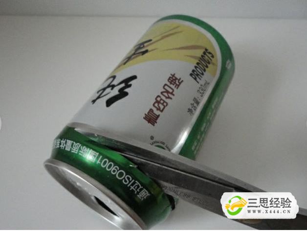 取一只空瓶的易拉罐,然后洗干凈。沿著(zhù)罐頂進(jìn)行環(huán)切(注意不要全切,要留3—4厘米左右保持和灌體相連)。