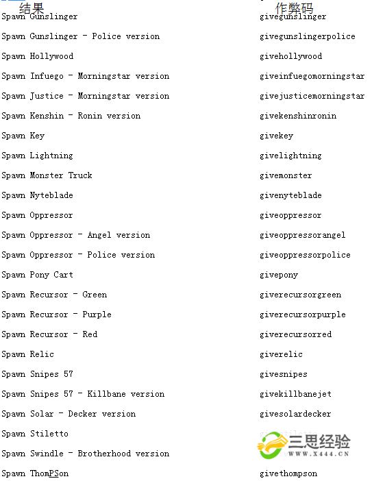 想要刷新車(chē)輛,使用以下作弊碼吧,不過(guò)很可惜全網(wǎng)都找不到車(chē)輛翻譯的中文,自己挨個(gè)試一遍,看喜歡哪個(gè),或者自己翻譯一下吧。