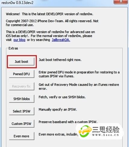 再次打開(kāi)Redsn0w,然后依次點(diǎn)擊“Extras”、“Just boot”。然后按照屏幕提示進(jìn)行操作即可完成引導啟動(dòng),完成不完美越獄。